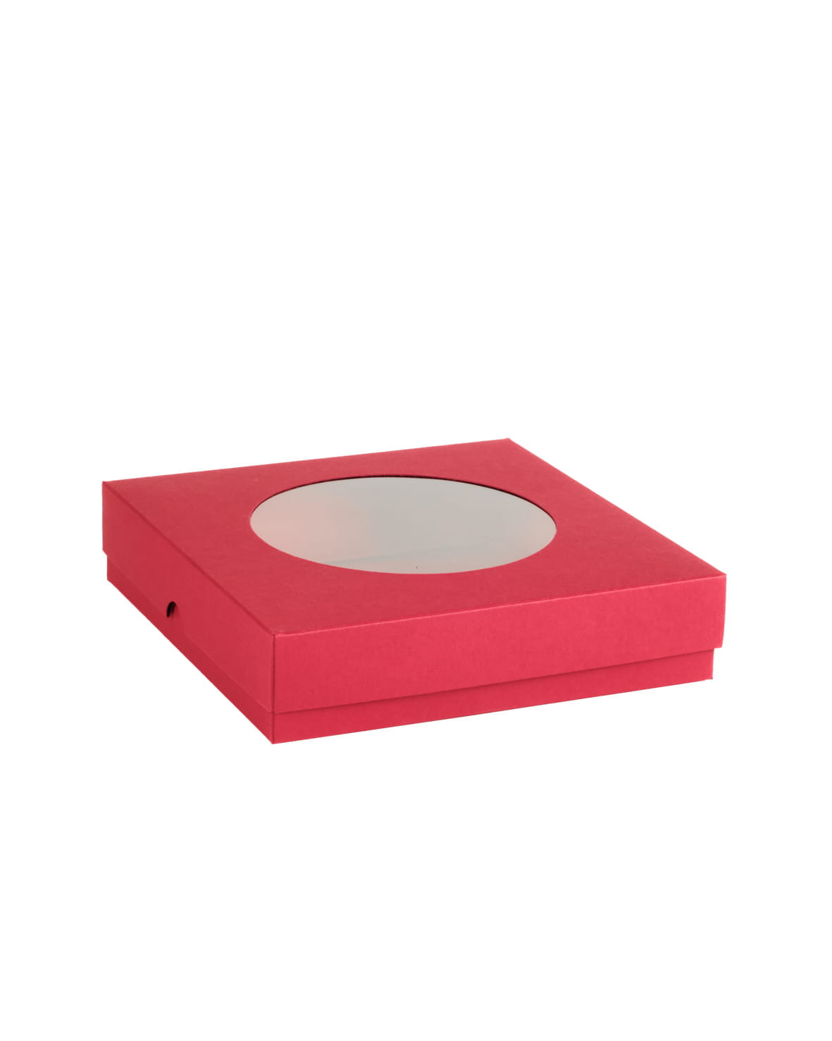 Pudełko z okienkiem okrągłym wysokie Kwadrat, czerwony, 15 x 15 x 3,5cm