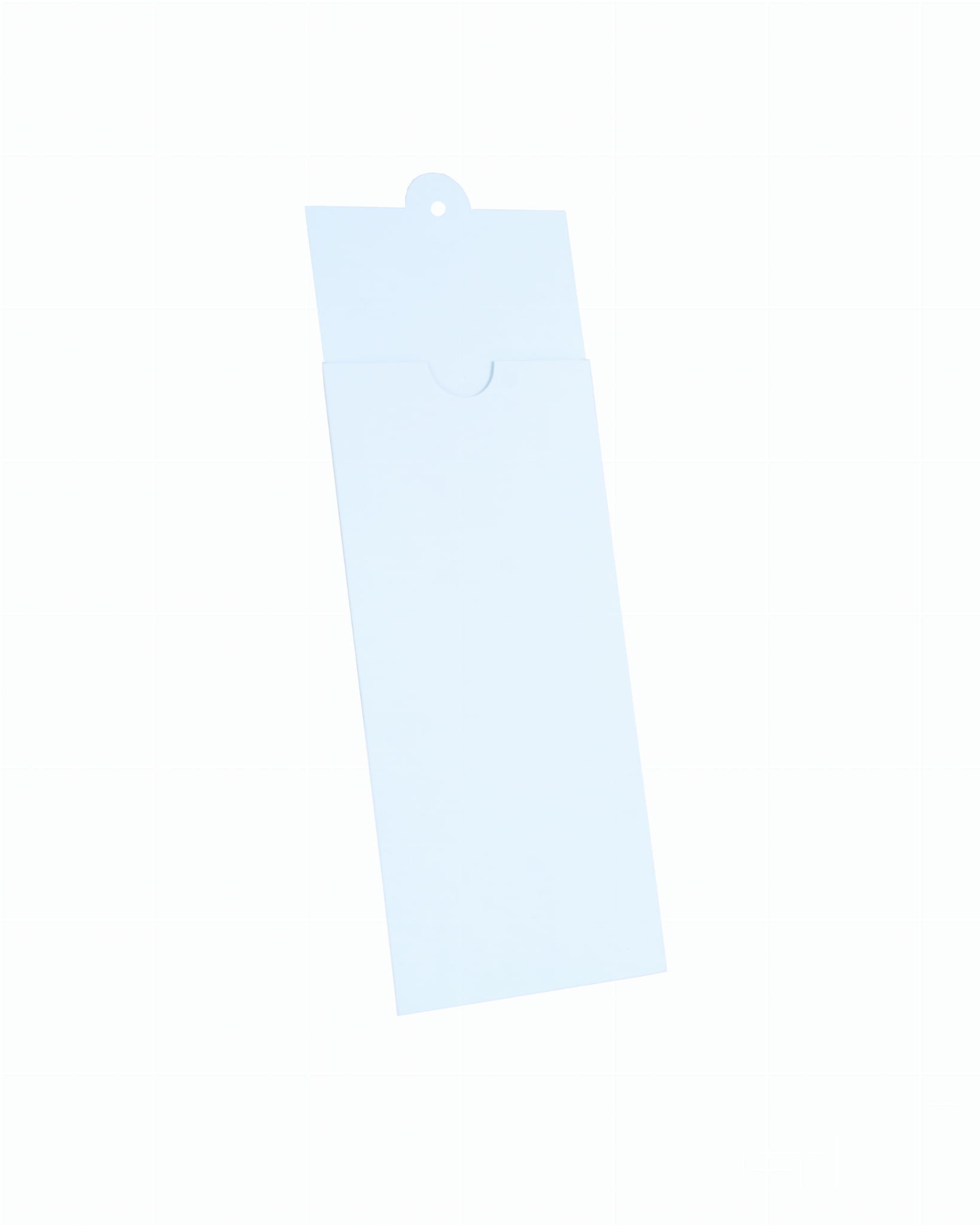 Rozmiar 10x21 cm, wykonane z papieru o gramaturze 300gm2. Składa się z dwóch części. Kieszonki i wkładu. Kieszonka jest bigowana co ułatwia składanie. Bok oraz dolna część kieszonki posiadają bigowane listewki, które wymagają sklejenia dla uzyskania efektu kieszonki. Od góry wykonane jest wycięcie o średnicy 2,5cm. Wkład na tekst jest jednoczęściowy, od góry posiada okrągłe wykończenie, które ułatwia wyjęcie z foldera. Dodatkowo posiada otwór przez który można przeciągnąć ozdobną tasiemkę. Idealnie nadaje się do ręcznego zdobienia różnymi materiałami: mediami, papierami do scrapbookingu itp.